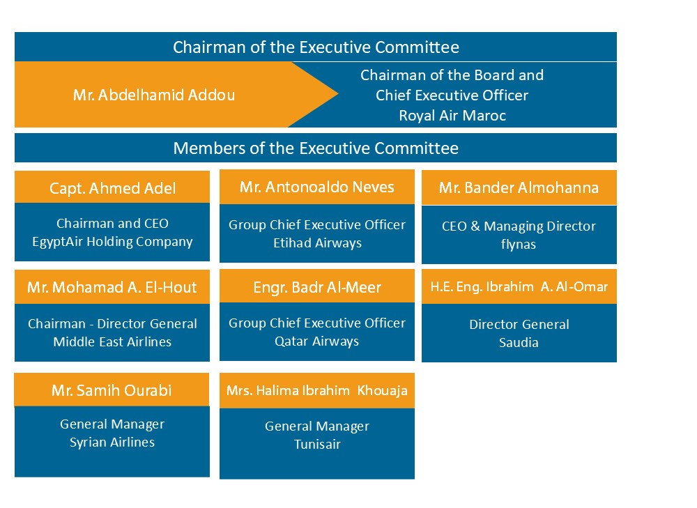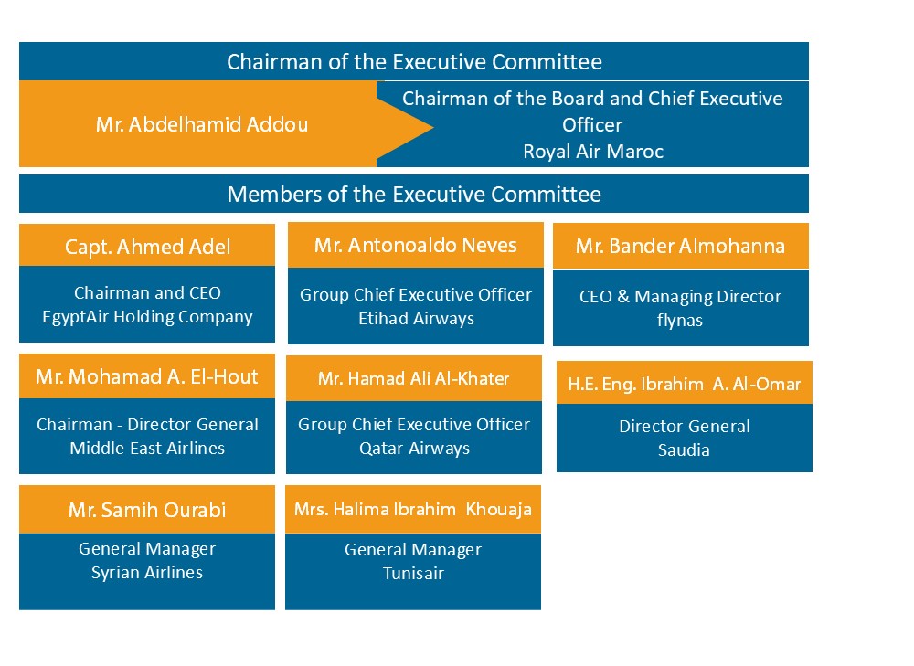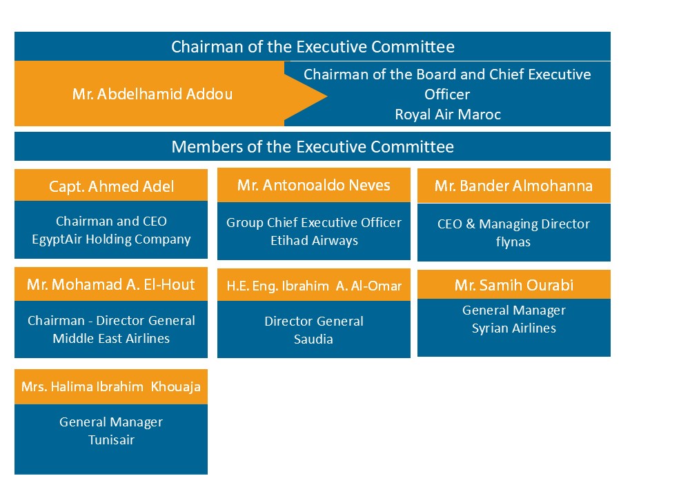 AACO Executive Committee consists of the Chief Executive Officers of nine elected active AACO member airlines, for a three-year renewable term. Moreover, the Chairman of the AGM for the term of that Annual General Meeting, and the Chairman of the next AGM shall join the committee as non-elected members.